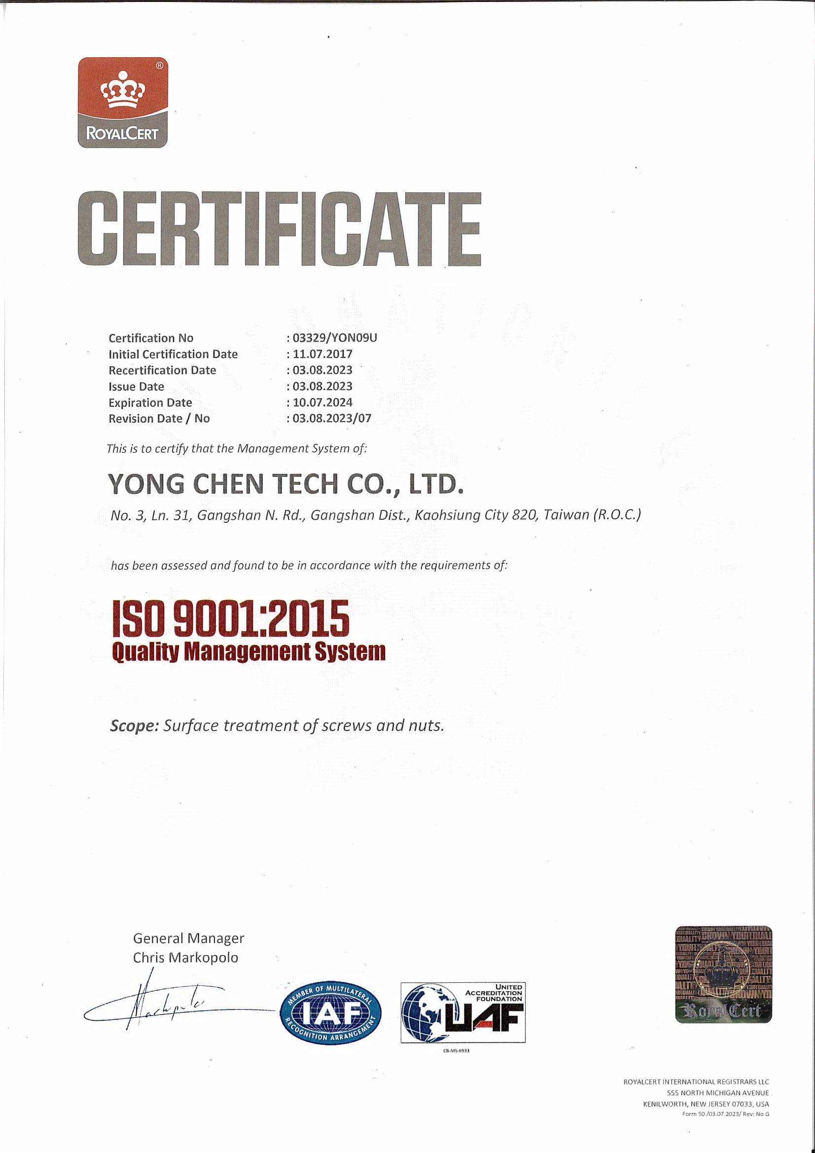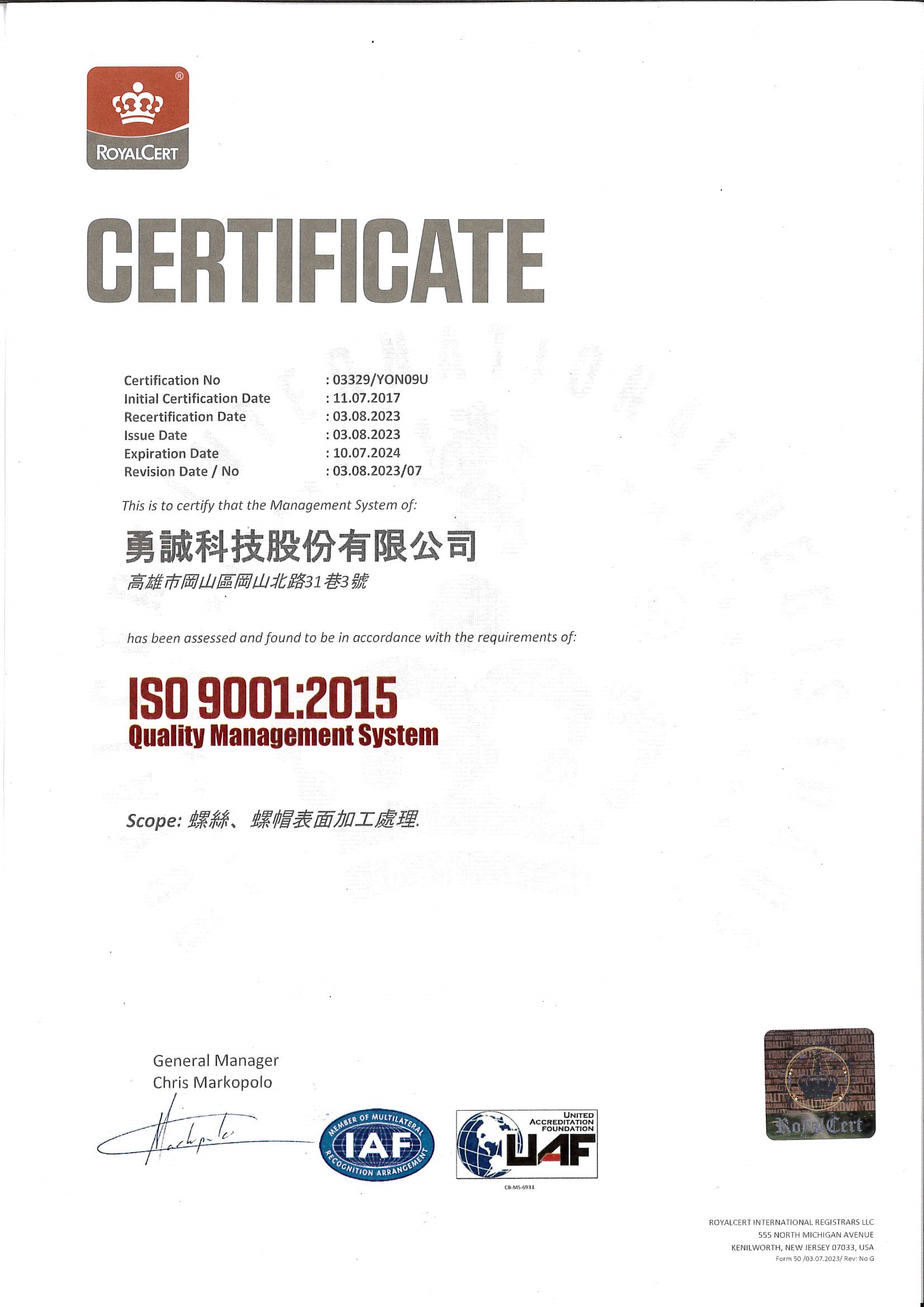 勇誠科技股份有限公司成立於2015年,是一家專業製作防鬆、防漏製程的公司,其產品可用於螺絲、螺帽之牙上,組裝之後藉由產品之特性達到防鬆及防漏的效果,公司有專業的技術人員、特製的設備及瞭解規範的品管人員,提供客戶專業和及時的服務。我司可配合客戶之要求進行客製化之製程或產品,期望成為客戶之最佳合作夥伴。